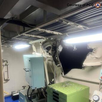 同时他们还声称,菲海警的两艘船都被中国海警撞了。其中4410船被中国海警21551艇擦撞了两次(也就是中国海警放出的视频),而4411船是被中国海警056改的3104舰撞的,被撞过程没有被中方放出。但菲律宾拿出了三张照片(图1-图3),说4411船被中国海警船撞出了一个直径5英寸(约13厘米)的大洞,而且已经将船撞透,一直破到了船舱内部。不过那洞看起来不像那么小,不排除是菲律宾人将5英尺(约1.5米)错写成了5英寸。